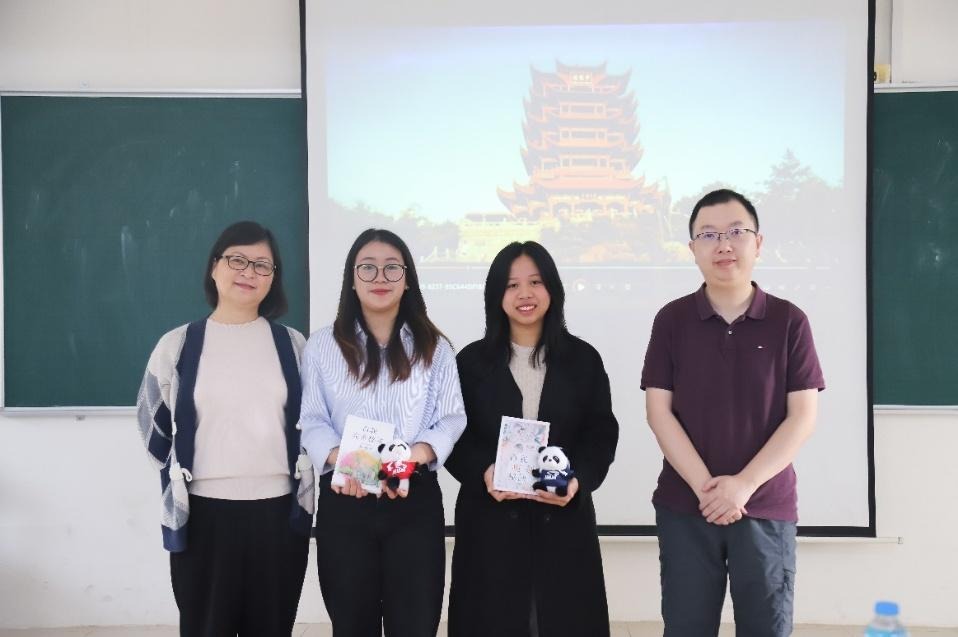Students Le Thi Hong Nhung and Vu Thi Minh Anh presenting in Chinese about Wuhan City and HUST.