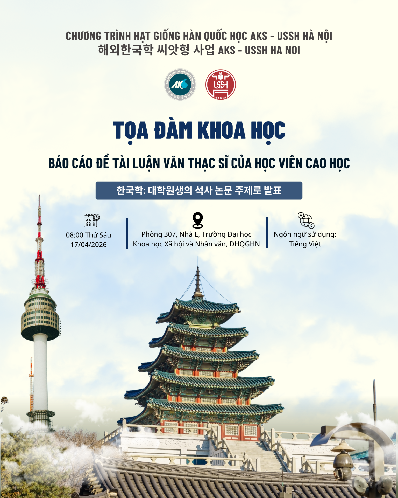 Chương trình sẽ được bắt đầu từ 8 giờ sáng thứ sáu, ngày 17/04/2026 tại Phòng 307, Tòa nhà E, Trường Đại học Khoa học Xã hội và Nhân văn (USSH, Hà Nội) với sự tham dự của đông đảo các chuyên gia Hàn Quốc học, khách mời cùng các học viên cao học đang theo học tại Trường Đại học Khoa học Xã hội và Nhân văn và các trường đại học khác trên địa bàn Hà Nội.