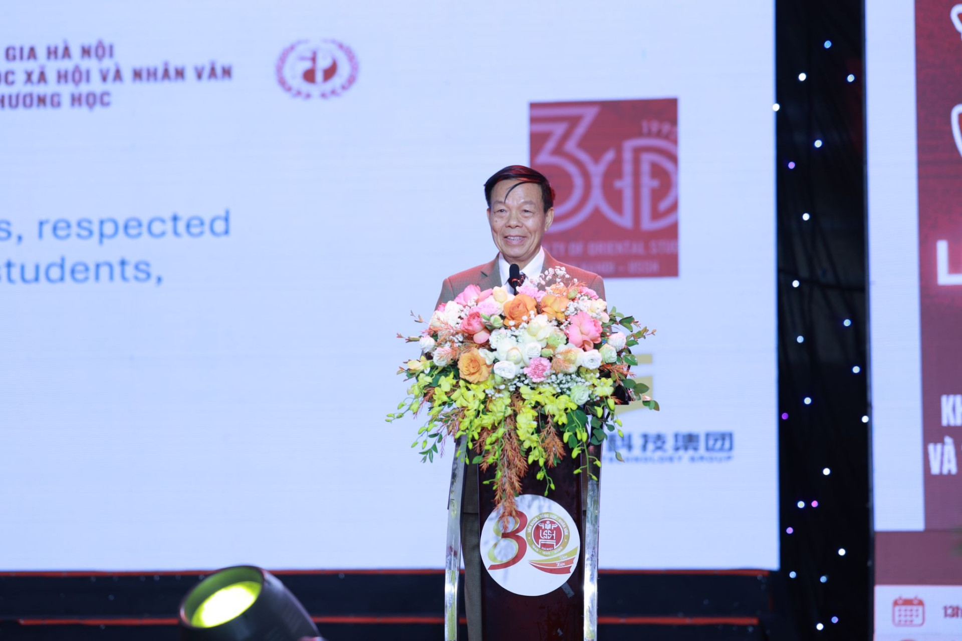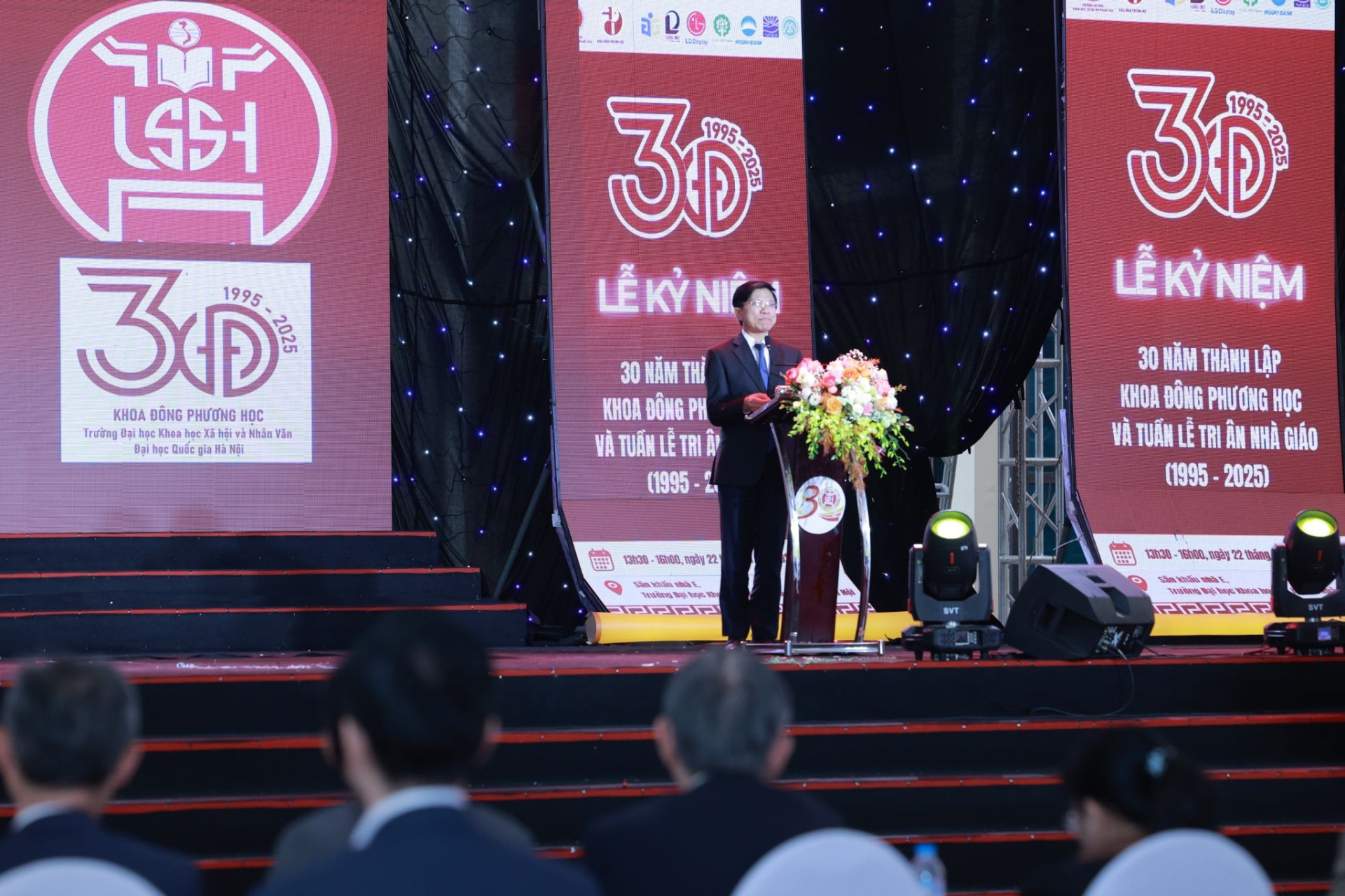 Phát biểu tại buổi lễ, TS. Phạm Hoàng Hưng, Trưởng Khoa Đông phương học đã nhấn mạnh chặng đường 30 năm là hành trình kiến tạo và bồi đắp những giá trị học thuật bền vững. Từ tiền thân là ngành Đông phương học thuộc Trường Đại học Tổng hợp Hà Nội (1993), đến dấu mốc chính thức thành lập năm 1995, Khoa đã phát triển thành môi trường đào tạo uy tín với hàng nghìn cử nhân, thạc sĩ và tiến sĩ thuộc các ngành và chuyên ngành như Đông phương học, Đông Nam Á học, Nhật Bản học, Hàn Quốc học, Trung Quốc học, Ấn Độ học, Thái Lan học, Đông Nam Á học và Châu Á học.