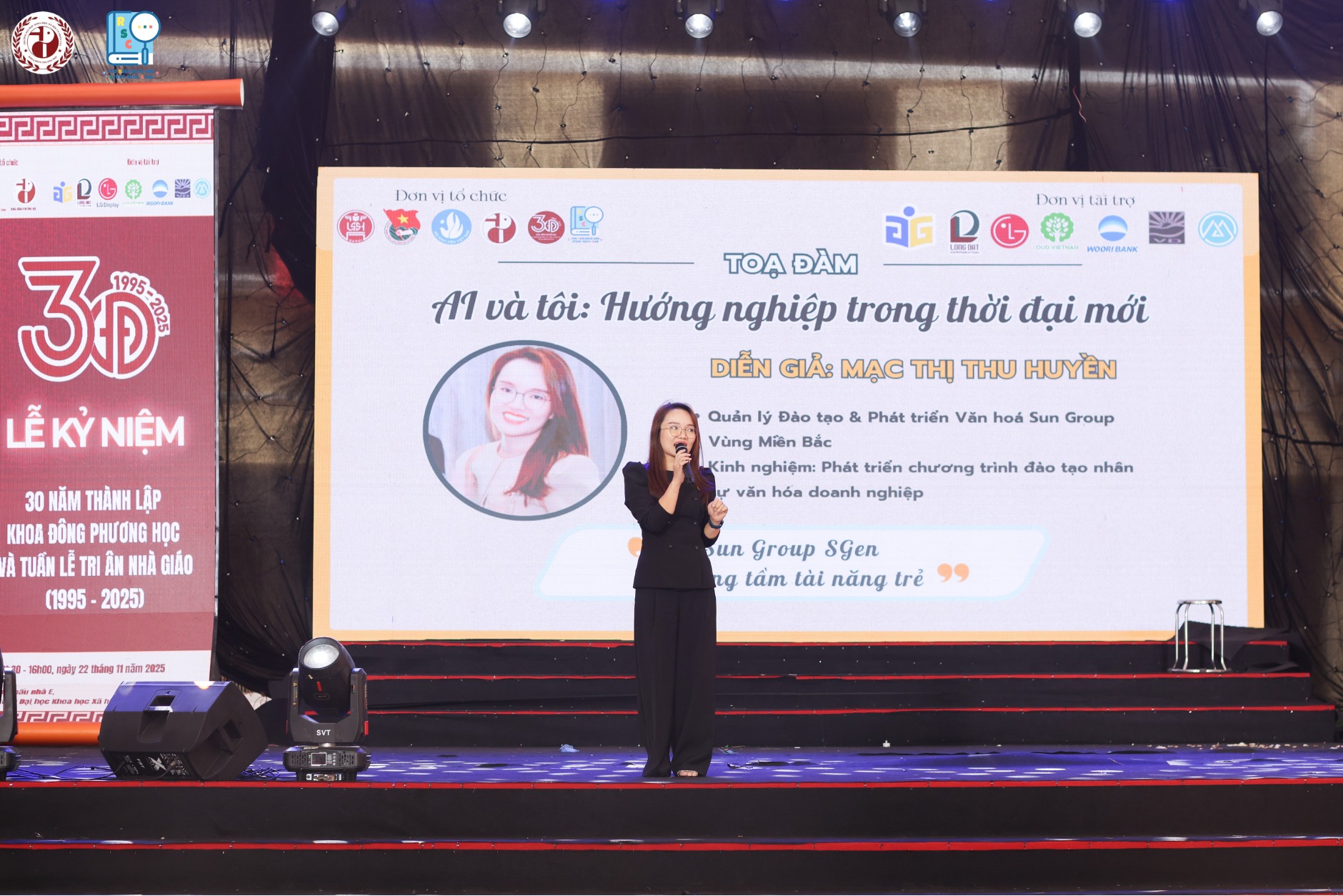 💡 Trong phần trình bày chính, các diễn giả đã phân tích những lợi ích, hạn chế và tác động của AI đối với học tập và công việc. Bên cạnh đó, các cô cũng nhấn mạnh cách sử dụng AI một cách đúng đắn, an toàn và hiệu quả; giới thiệu xu hướng tuyển dụng mới; phân tích văn hóa doanh nghiệp 4.0; đồng thời chia sẻ phương pháp xây dựng kỹ năng cá nhân. Những câu chuyện và kinh nghiệm thực tế từ môi trường doanh nghiệp đã giúp sinh viên hình dung rõ hơn về yêu cầu của thị trường lao động hiện nay, đặc biệt là đối với sinh viên ngành Đông phương học.