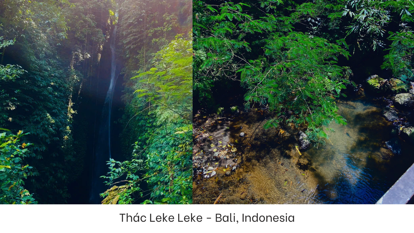 Rồi những ngày sau, tụi mình đi thăm và tìm hiểu rất nhiều đền đài, di sản văn hoá, phong cảnh thiên nhiên, các bãi biển, và cả các trung tâm văn hoá và chợ truyền thống ở Bali. Mình như lạc trong những giấc mơ thật đẹp, từ Taman Ayun Temple với những ngôi đền cổ kính linh thiêng, Leke Leke - thác nước buông xuống như dải lụa trắng, cho đến Jatiluwih - với những thửa ruộng bậc thang xanh ngút ngàn... Jatiluwwih, di sản UNESCO đó, nhưng phải tận mắt đến nơi này mới hiểu đây chính là cái nôi văn hoá và sự sống nuôi dưỡng bao thế hệ con người Bali. Tụi mình còn định ngắm hoàng hôn ở đền Tanah Lot, nhưng sức khỏe cả đoàn không cho phép. Thế là bỏ lỡ và tiếc nuối. Nhưng có lẽ, sự tiếc nuối cũng là một phần của chuyến đi.